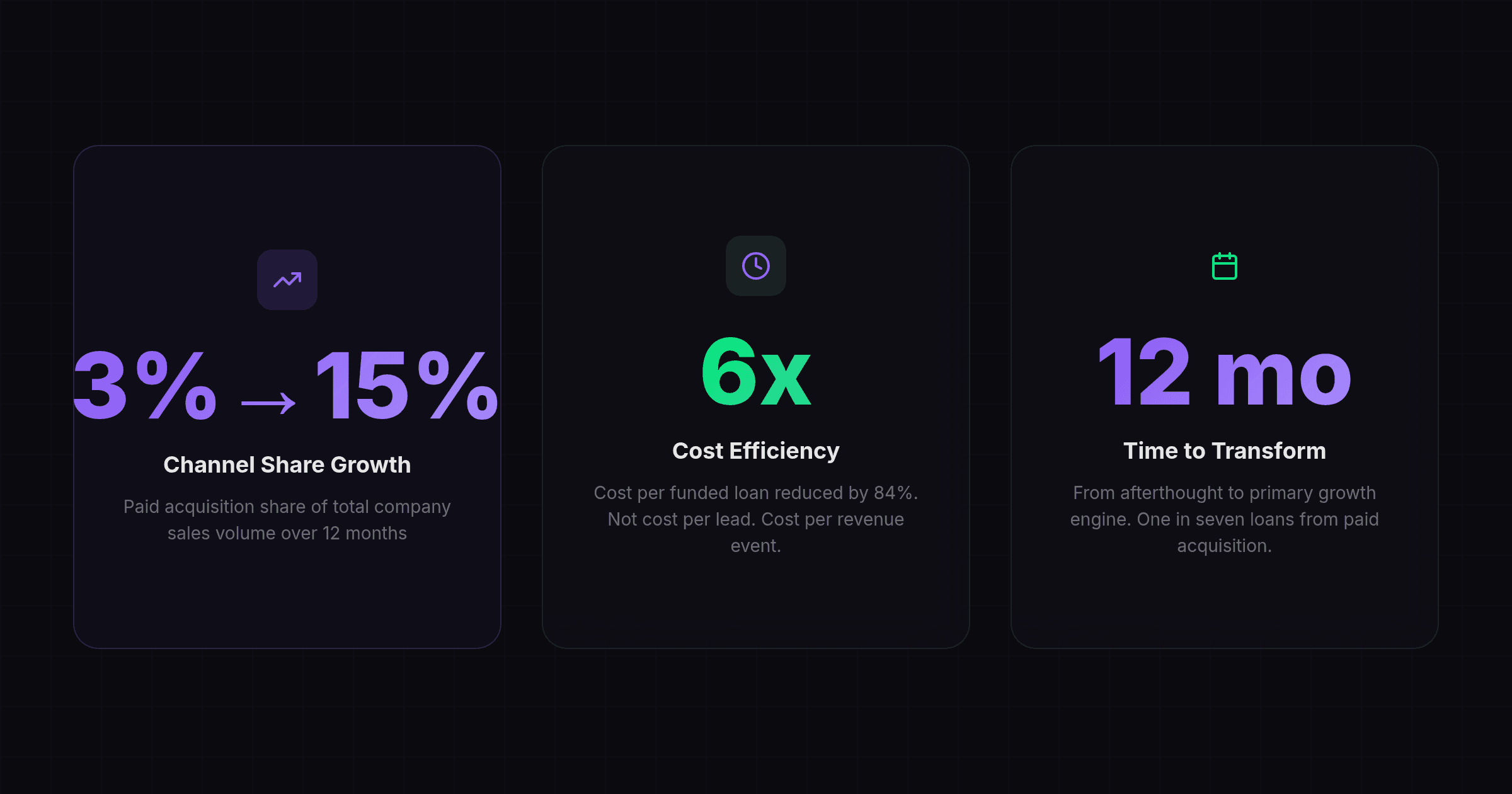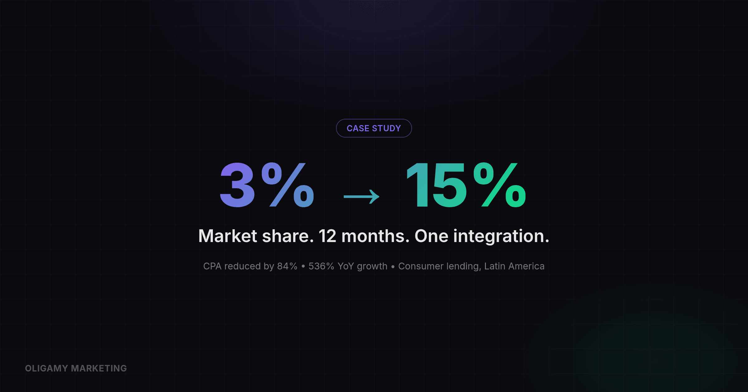 536% YoY growth. 84% lower cost per funded loan. Market share from 3% to 15%. Twelve months. One integration.