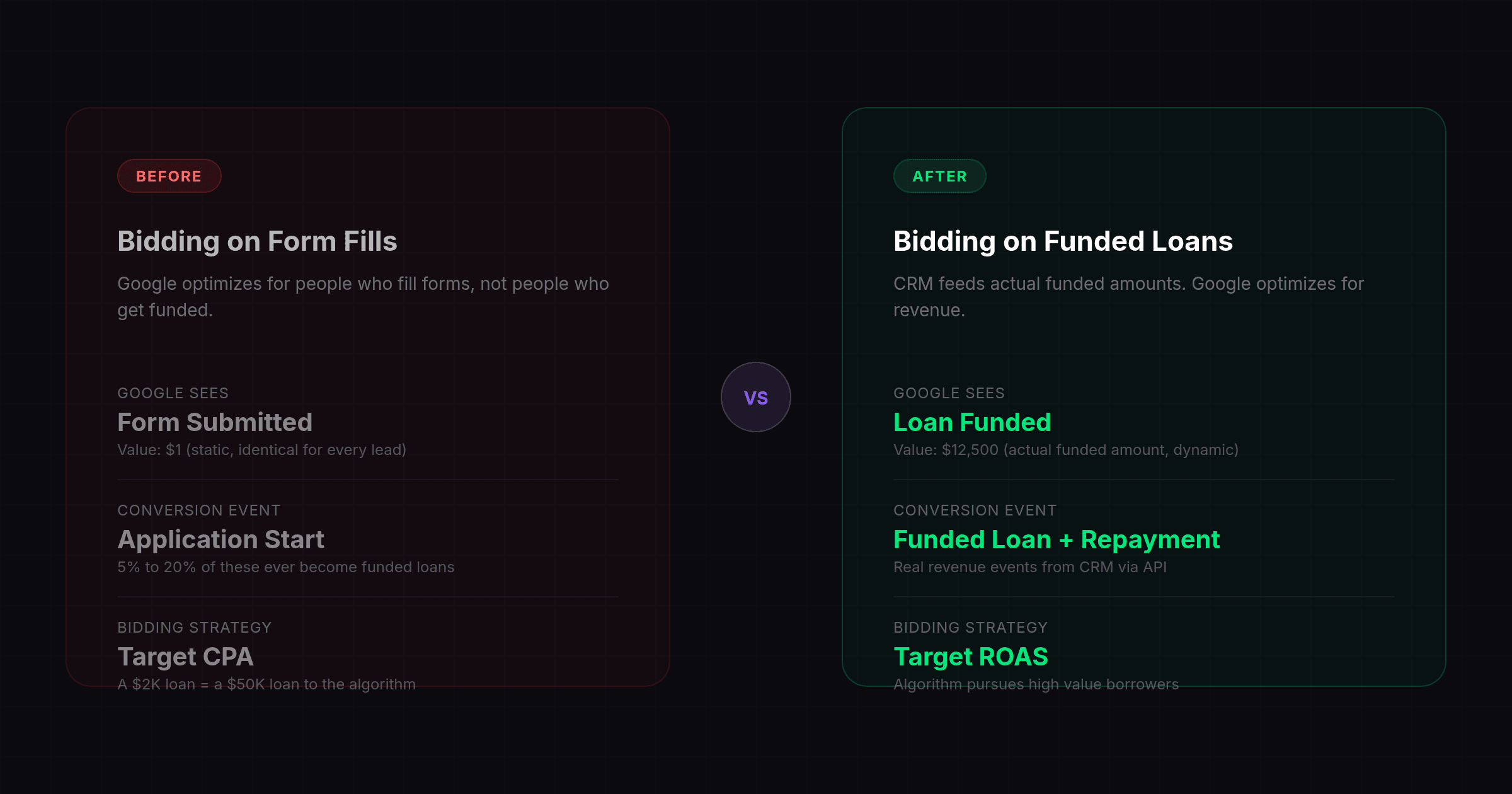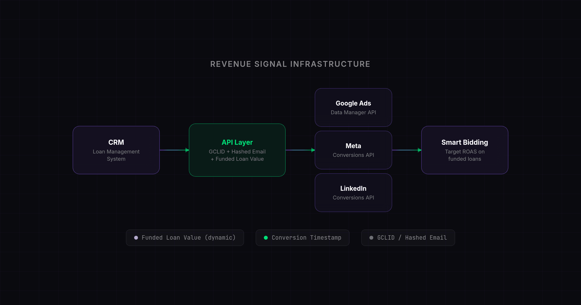 - The core infrastructure required to fix this is a CRM to Google Ads API integration that passes funded loan amounts and the original click identifier back to the bidding algorithm.