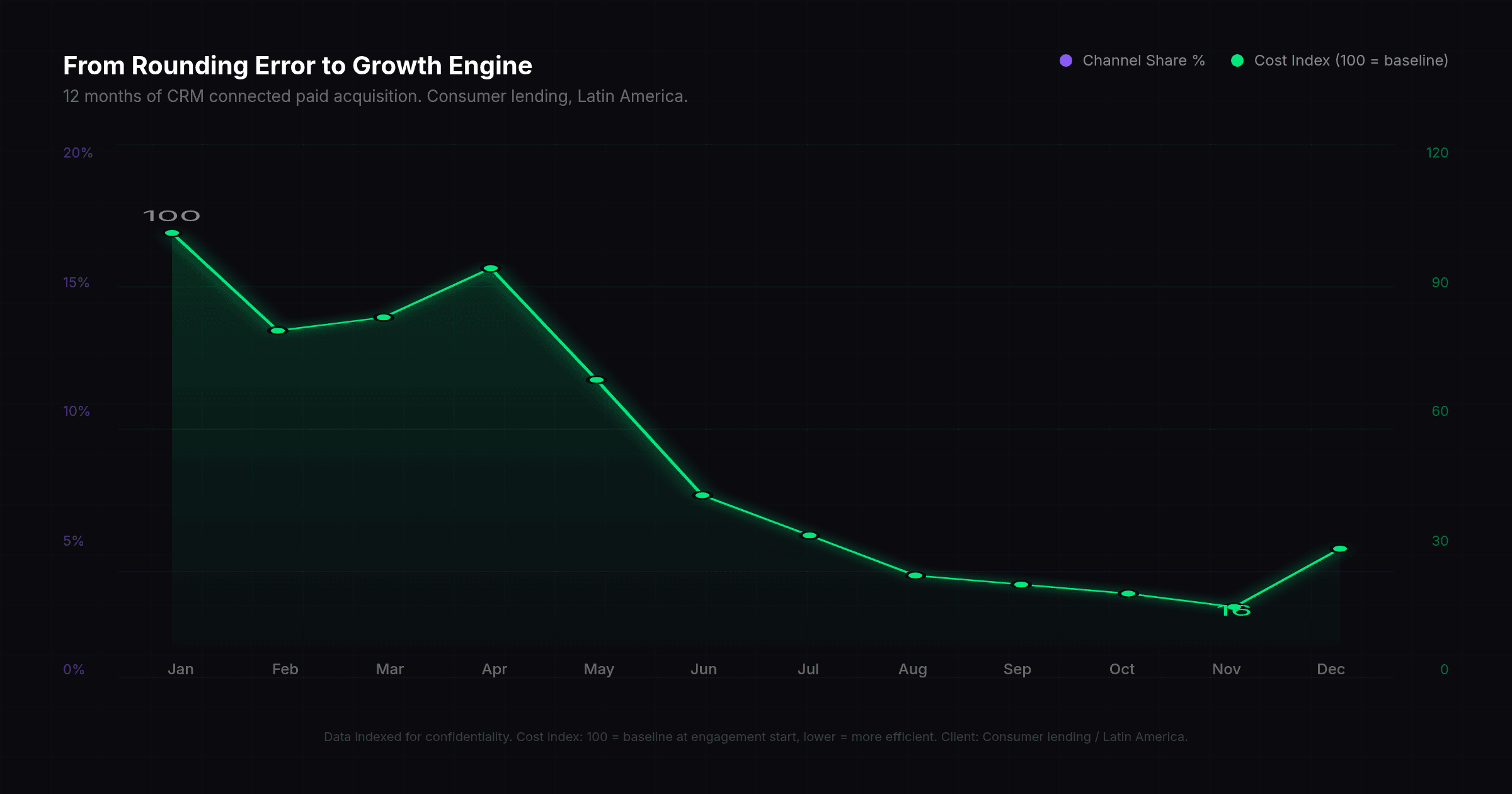 Data indexed for confidentiality. Channel share shown as percentage of total company sales volume. Cost index: 100 = baseline acquisition cost at engagement start, lower = more efficient. Client: Consumer lending / Financial services. Market: Latin America. All metrics represent actual engagement results, not projections or benchmarks.